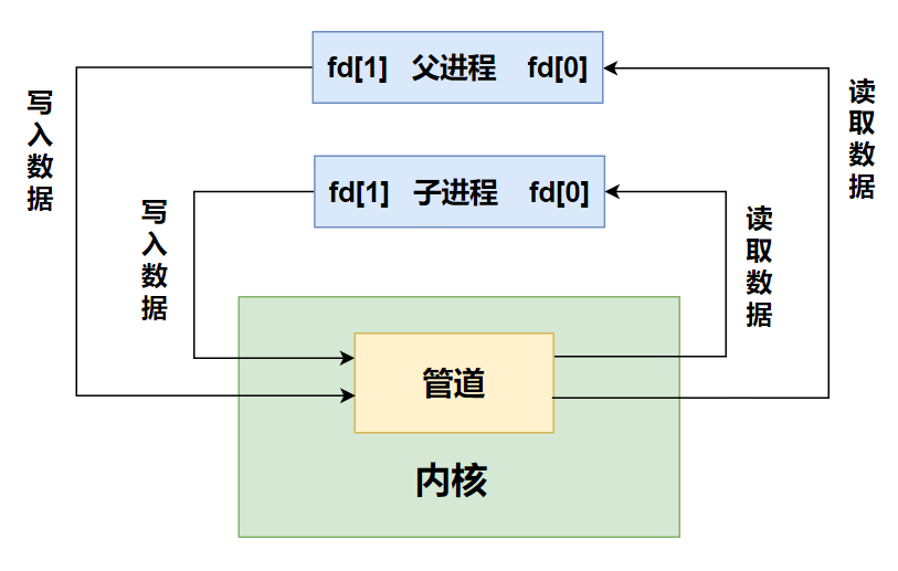 这两端使用文件描述符的方式来读取,故进程创建管道实际上是内核为其返回了用于读取管道缓冲区的文件描述符,一个描述符用于读,另一个描述符用于写。通常情况下是用户进程为内核提供一个长度为2的文件描述符数组,内核会在该数组中写入管道操作的两个描述符,假设数组名为fd,那么fa[0]用于读取管道,fa[1]用于写入管道。