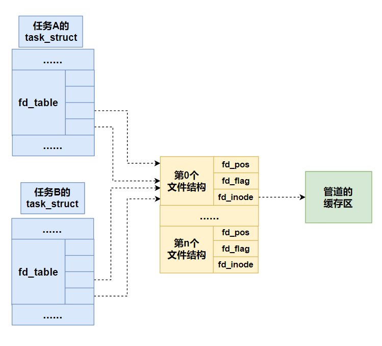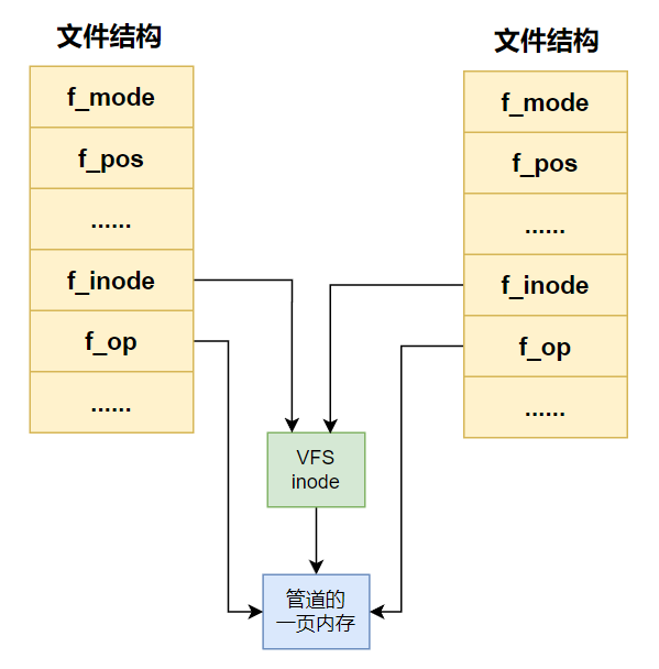文件结构中的 f_inode 指向 VFS 的 inode,该 inode 指向 1 个页框大小的内存区域,该区域便是管道用于存储数据的内存空间。 也就是说,Linux的管道大小是 4096 字节。f_op用于指向操作(OPeration)方法,也就是说,不同的操作对象有不 同的操作方法,针对不同的操作对象,Linux会把f_op指向不同的操作例程。 对于管道来说,f_op会指向pipe_read和pipe_write,pipe_read会从管道的1页 内存中读取数据,pipe_write会往管道的1页内存中写入数据。