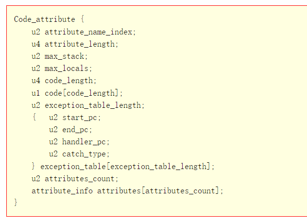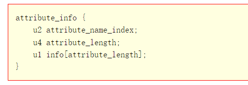 属性表的每个项的值必须是attribute_info结构。属性表的结构比较灵活,各种不同的属性只要满足以下结构即可。