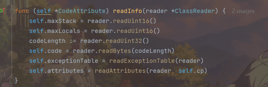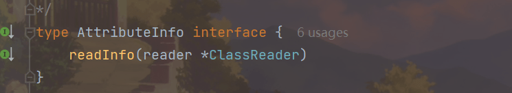 和ConstantInfo接口一样,AttributeInfo接口也只定义了一个类似readInfo()的方法,需要由具体的属性实现。readAttributes()函数读取属性表,代码如下: