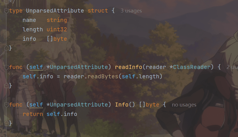 UnparsedAttribute结构体在classfile\attr_unparsed.go文件中,代码如下: