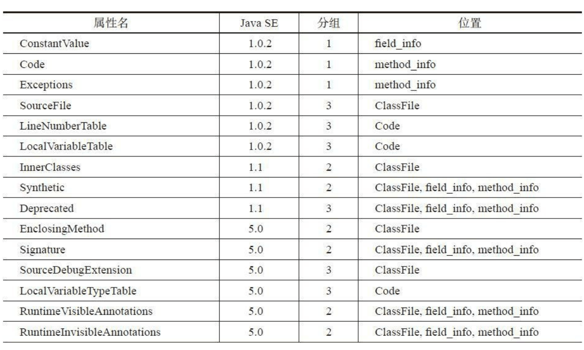 下图给出了这23种属性出现的Java版本、分组以及它们在class文件中的位置。