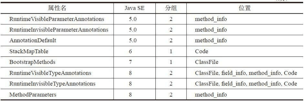 JDK1.0时只有6种预定义属性,JDK1.1增加了3种。J2SE 5.0增加了9种属性,主要用于支持泛型和注解。Java SE 6增加了StackMapTable属性,用于优化字节码验证。Java SE 7增加了BootstrapMethods属性,用于支持新增的invokedynamic指令。Java SE 8又增加了三种属性。