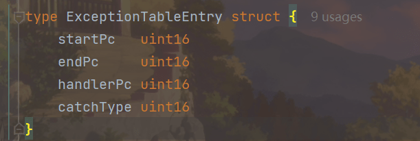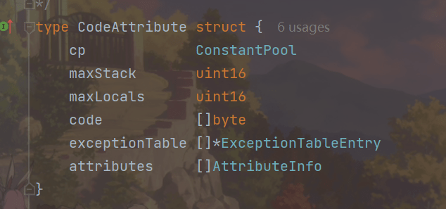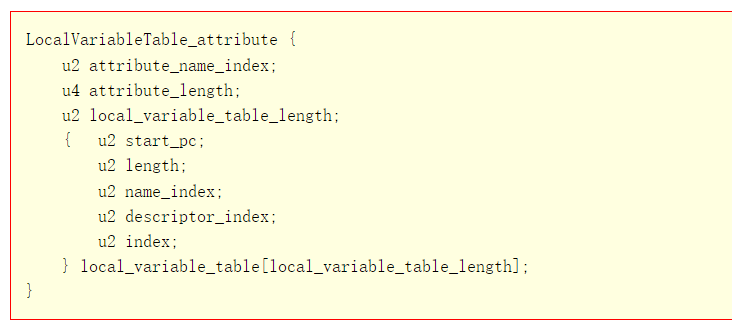 }把上面的结构定义翻译成Go结构体,定义在classfile/attr_local_variable_table.go文件中,代码如下: