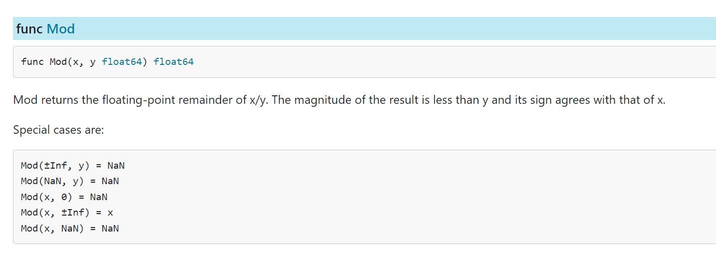 当一个操作产生溢出时,将会使用有符号的无穷大表示,如果某个操作结果没有明确的数学定义的话,将会使用NaN值来表示。而且所有使用NaN值作为操作数的算术操作,结果都会返回NaN;