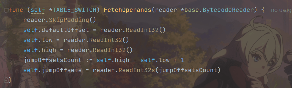 }tableswitch指令的操作数比较复杂,它的FetchOperands()方法如下: