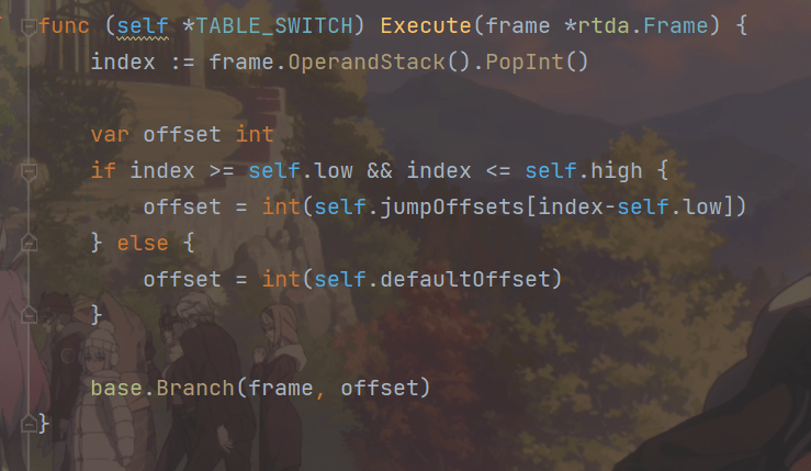 Execute()方法先从操作数栈中弹出一个int变量,然后看它是否在low和high给定的范围之内。如果在,则从jumpOffsets表中查出偏移量进行跳转,否则按照defaultOffset跳转。代码如下: