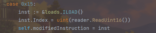 wide指令改变其他指令的行为,modifiedInstruction字段存放被改变的指令。wide指令需要自己解码出modifiedInstruction,FetchOperands()方法先从字节码中读取一字节的操作码,然后创建子指令实例,最后读取子指令的操作数。因为没有实现ret指令,所以暂时调用panic()函数终止程序执行。加载指令和存储指令都只有一个操作数,需要扩展成2字节,以iload为例: