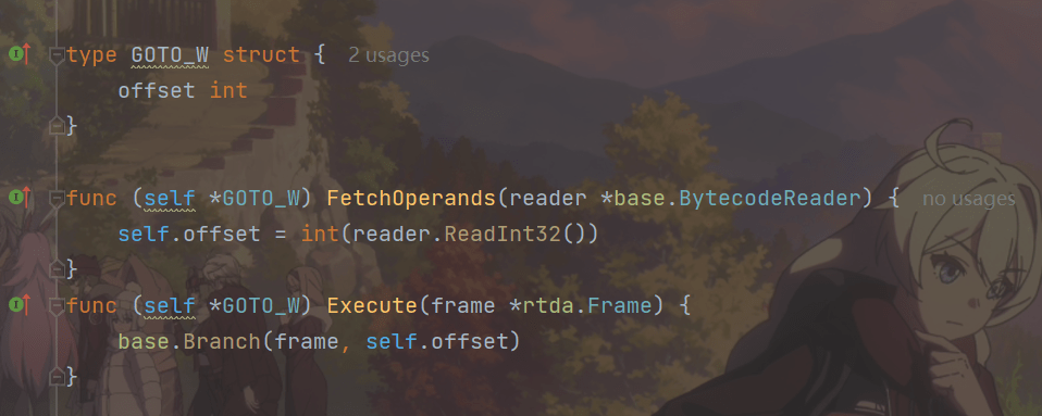 goto_w指令和goto指令的唯一区别就是索引从2字节变成了4字节。FetchOperands()方法代码如下: