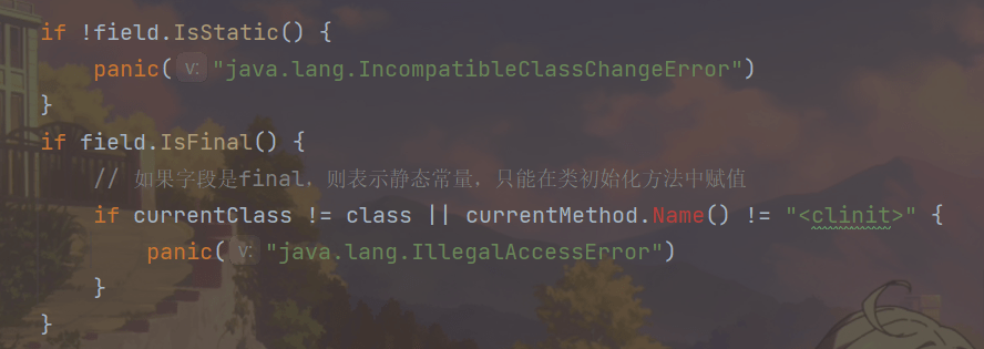 if currentClass != class || currentMethod.Name() != "<clinit>" {