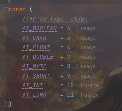 newarray指令需要两个操作数。第一个操作数是一个uint8整数,在字节码中紧跟在指令操作码后面,表示要创建哪种类型的数组。Java虚拟机规范把这个操作数叫作atype,并且规定了它的有效值。把这些值定义为常量,代码如下: