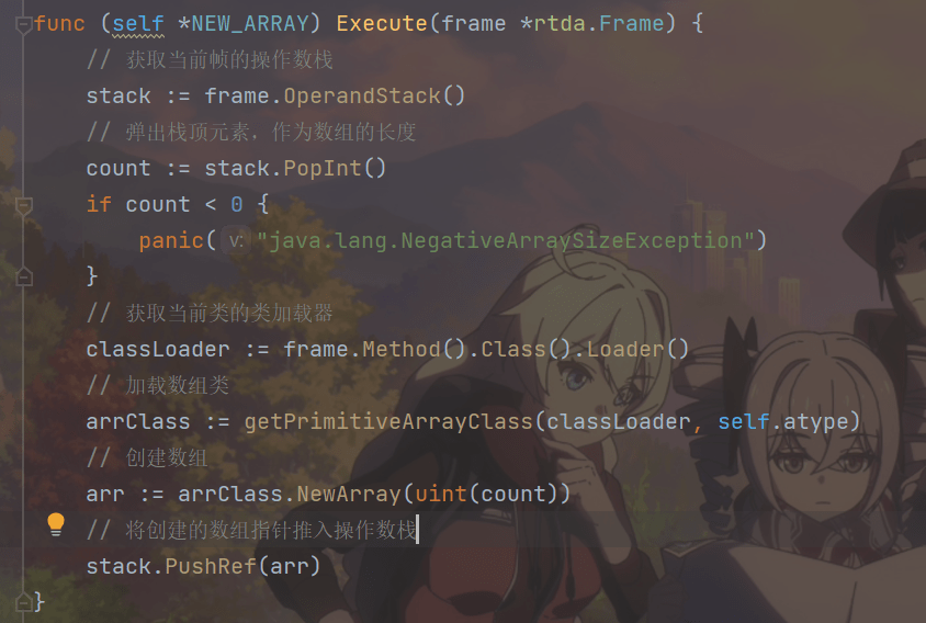 newarray指令的第二个操作数是count,从操作数栈中弹出,表示数组长度。Execute()方法根据atype和count创建基本类型数组,如果count小于0,则抛出NegativeArraySizeException异常,否则