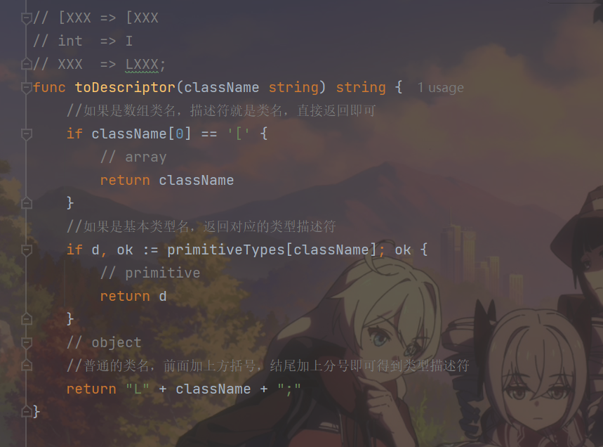 如果是数组类名,描述符就是类名,直接返回即可。如果是基本类型名,返回对应的类型描述符,否则肯定是普通的类名,前面加上方括号,结尾加上分号即可得到类型描述符。