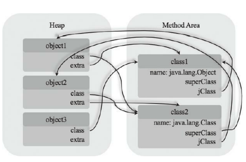 图只画出了Class和Object结构体的必要字段,并且刻意分开了堆和方法区。在方法区中,class1和class2分别是java.lang.Object和java.lang.Class类的数据。在堆中,object1和object2分别是