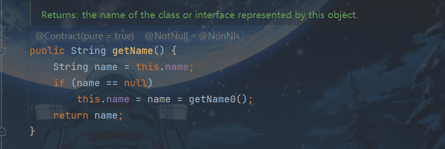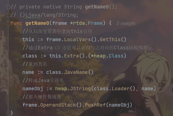 下面实现getName0()方法,首先从局部变量表中拿到this引用,这是一个类对象引用,通过Extra()方法可以获得与之对应的Class结构体指针。然后拿到类名,转成Java字符串并推入操作数栈顶。注意这里需要的是java.lang.Object这样的类名,而非java/lang/Object。Class结构体的JavaName()方法返回转换后的类名
