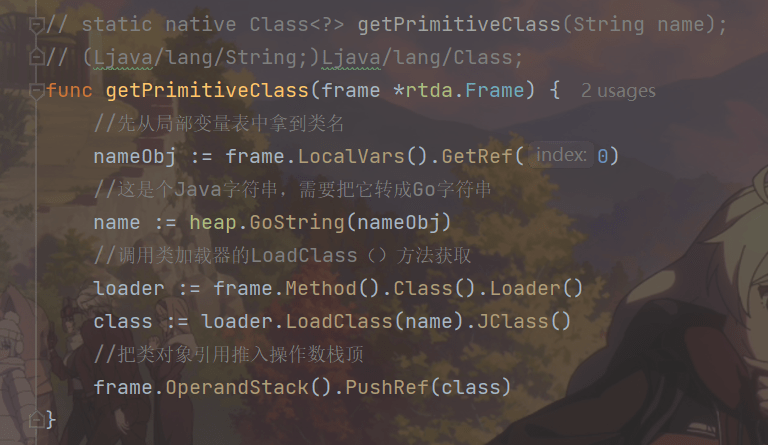 getPrimitiveClass()是静态方法。先从局部变量表中拿到类名,这是个Java字符串,需要把它转成Go字符串。基本类型的类已经加载到了方法区中,直接调用类加载器的LoadClass()方法获取即可。最后,把类对象引用推入操作数栈顶。