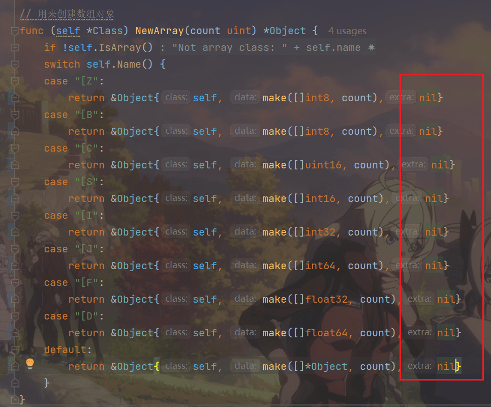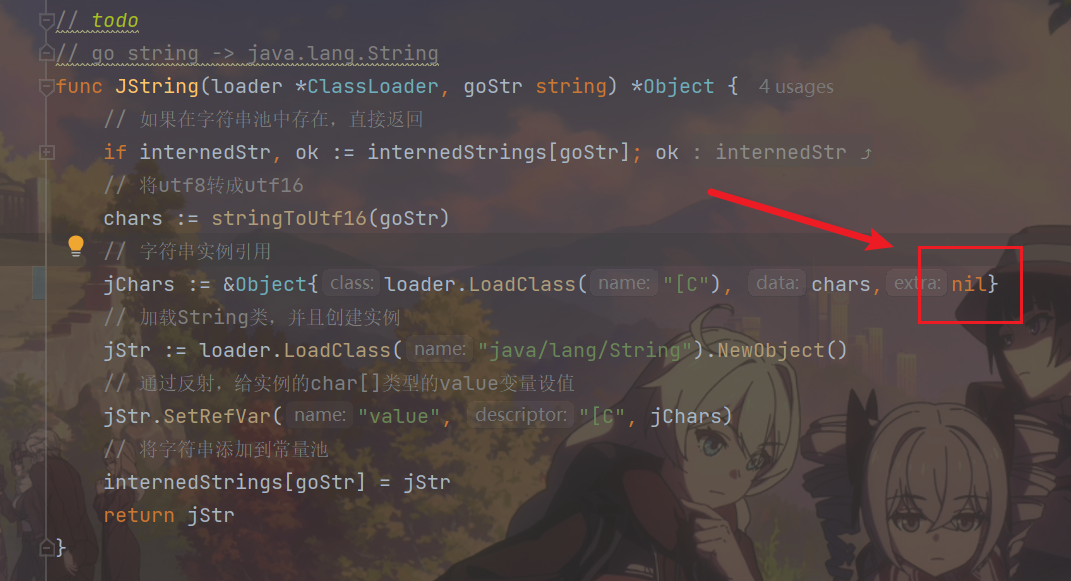 由于/rtdata/heap/object.go文件添加了extra属性,所以在array_class.go和string_pool.go文件中初始化Object结构体的时候要多加个参数,如图:
