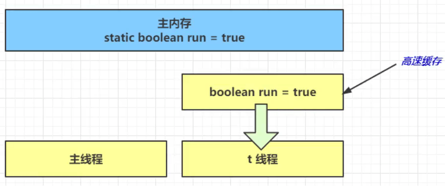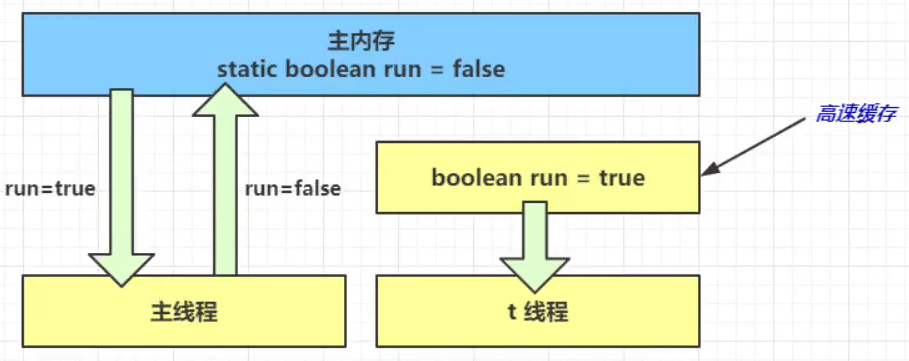 3. 1 秒之后,main 线程修改了 run 的值,并同步至主存,而 t 是从自己工作内存中的高速缓存中读取这个变量的值,结果永远是旧值