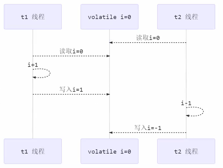比较一下之前我们将线程安全时举的例子:两个线程一个 i++ 一个 i– ,volatile只能保证看到最新值,不能解决指令交错