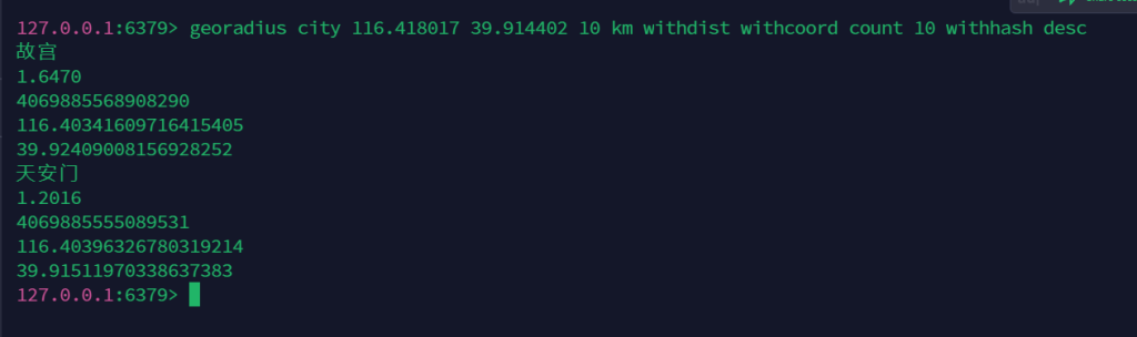 georadius city 116.418017 39.914402 10 km withdist withcoord count 10 withhash desc