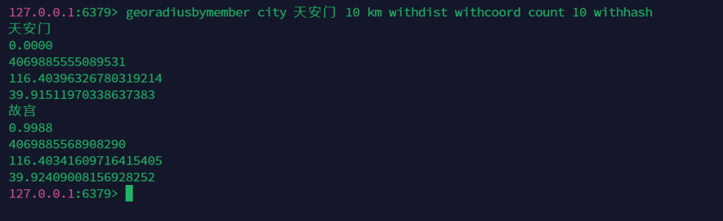 georadiusbymember city 天安门 10 km withdist withcoord count 10 withhash