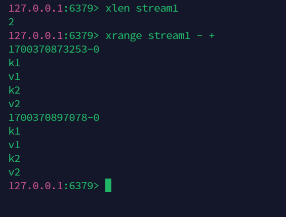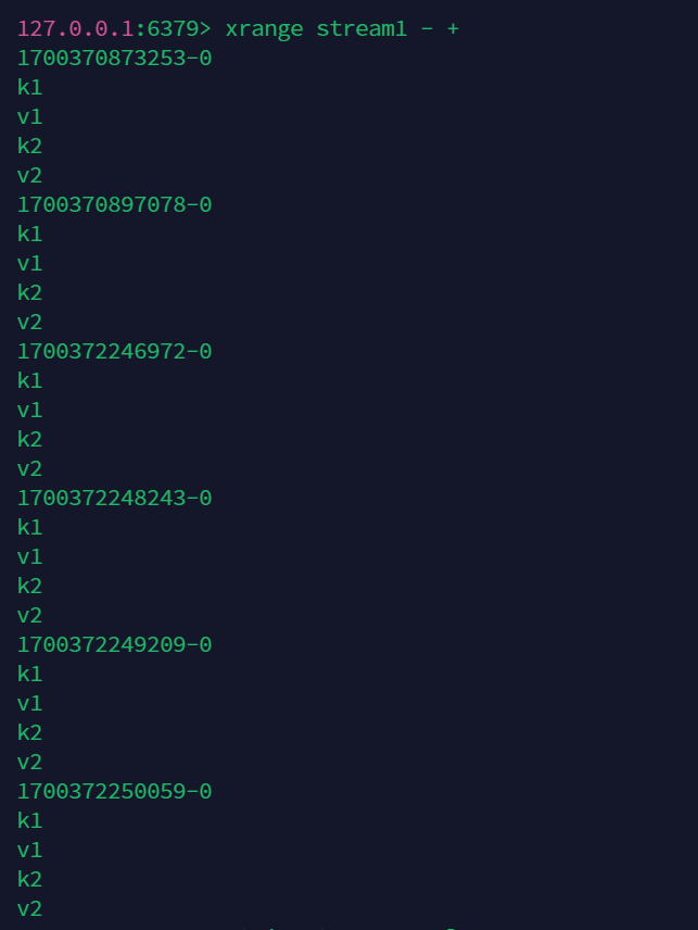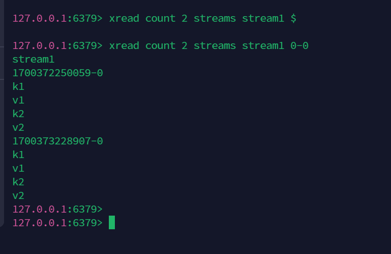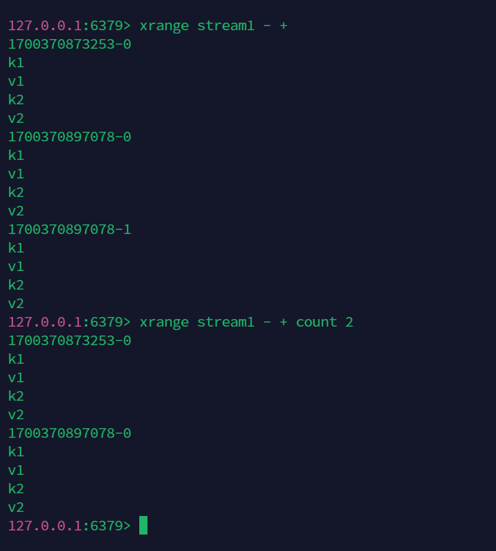 - 0-0代表从最小的ID开始获取Stream中的消息,当不指定count,将会返回Stream中的所有消息,注意也可以使用0或00