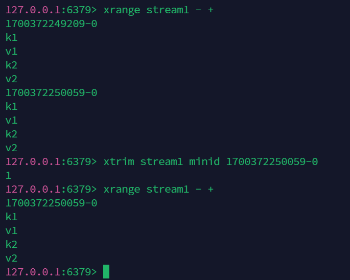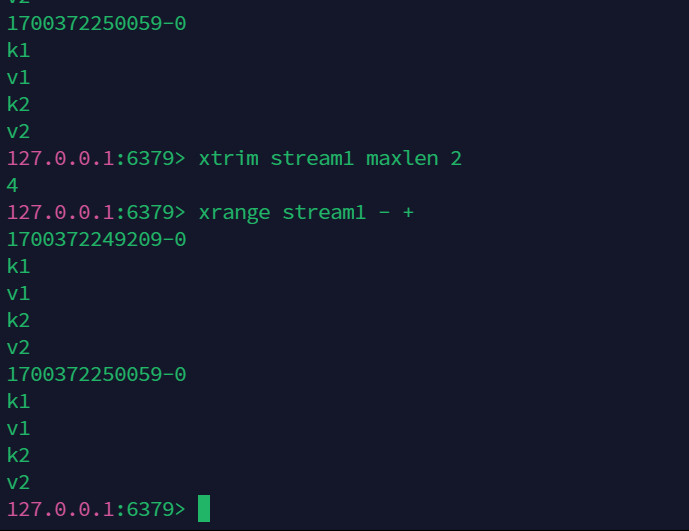 MAXLEN允许的最大长度,对流进行修剪限制长度;MINID允许的最小id,从某个id值开始比该id值小的将会被抛弃。