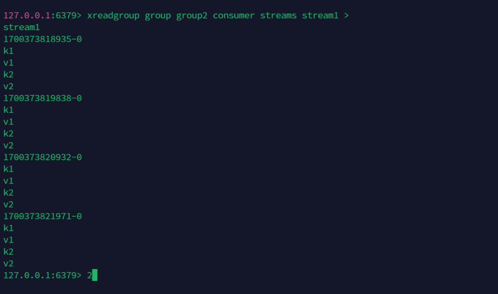 消费者2再去消费就为空了,stream中的消息一旦被消费组里的一个消费者读取了,就不能再被该消费组内的其他消费者读取了,即同一个消费组里的消费者不能消费同一条消息。
