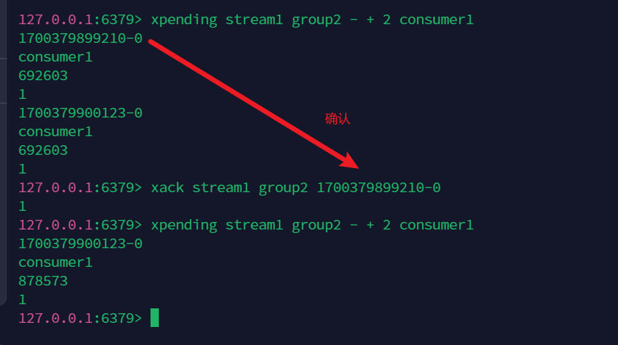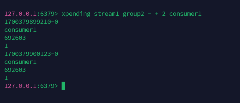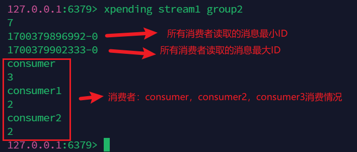 查看消费情况,查询每个消费组内所有消费者「已读取、但尚未确认」的消息,consumer即消费者名字,不加查询所有。