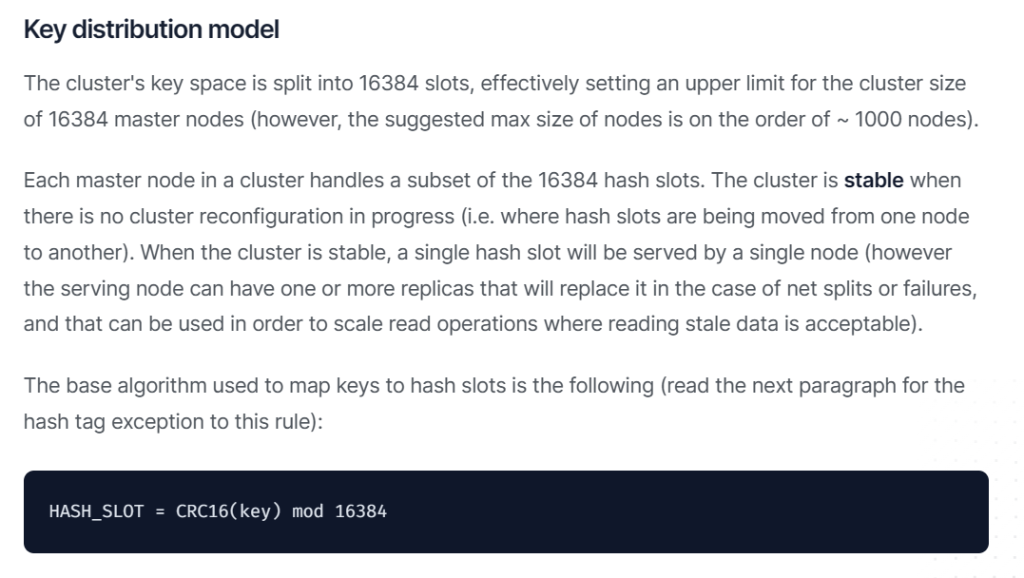 集群的键空间被分成16384个槽,有效地为集群大小设置了16384个主节点的上限(然而,建议的最大节点大小约为~ 1000个节点)。