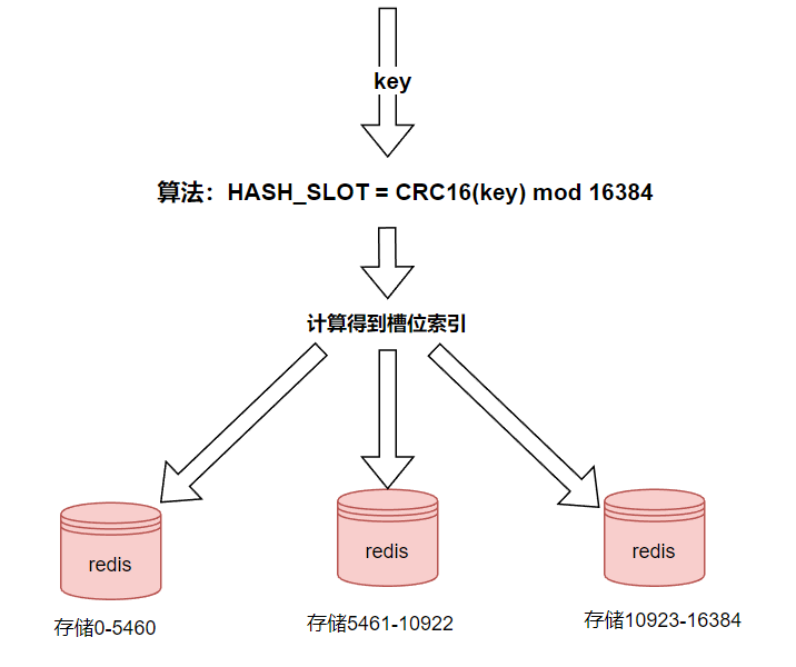 - 对key求哈希值,然后对16384取模,余数是几,key就落入对应的槽里。