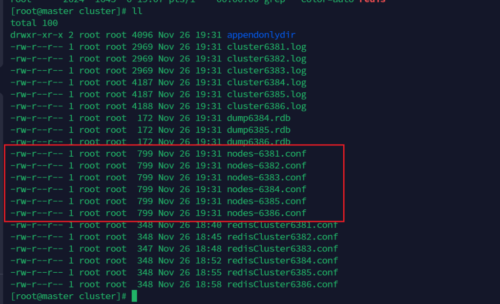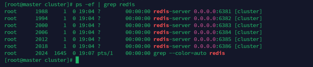 查看redis服务,当然我是在同一台主机上启动才能看到所有redis服务,不同主机应该只能看到一个后接[cluster]的服务,cluster就是表示以集群方式启动。