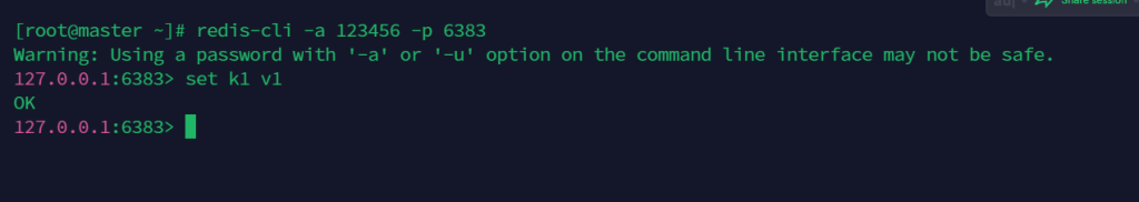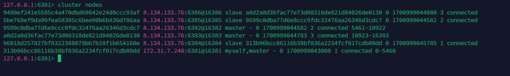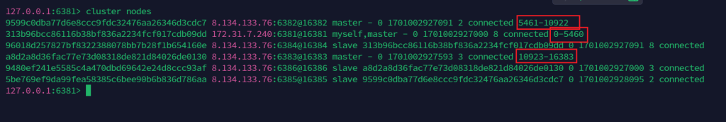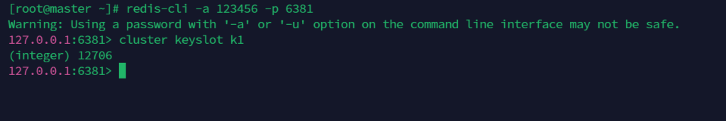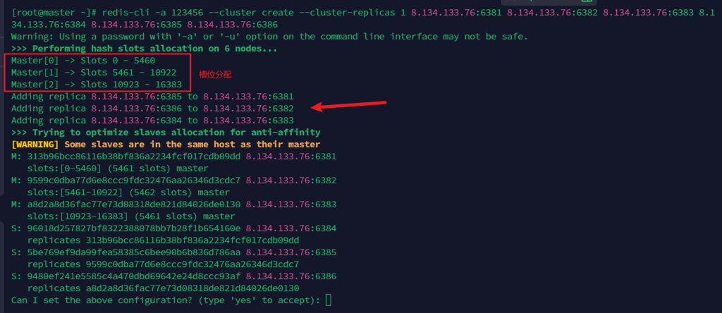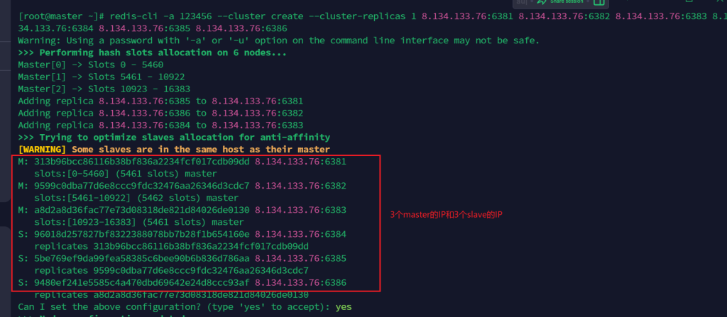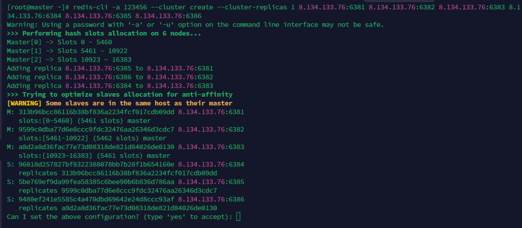 redis-cli -a 123456 --cluster create --cluster-replicas 1 8.134.133.76:6381 8.134.133.76:6382 8.134.133.76:6383 8.134.133.76:6384 8.134.133.76:6385 8.134.133.76:6386