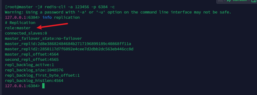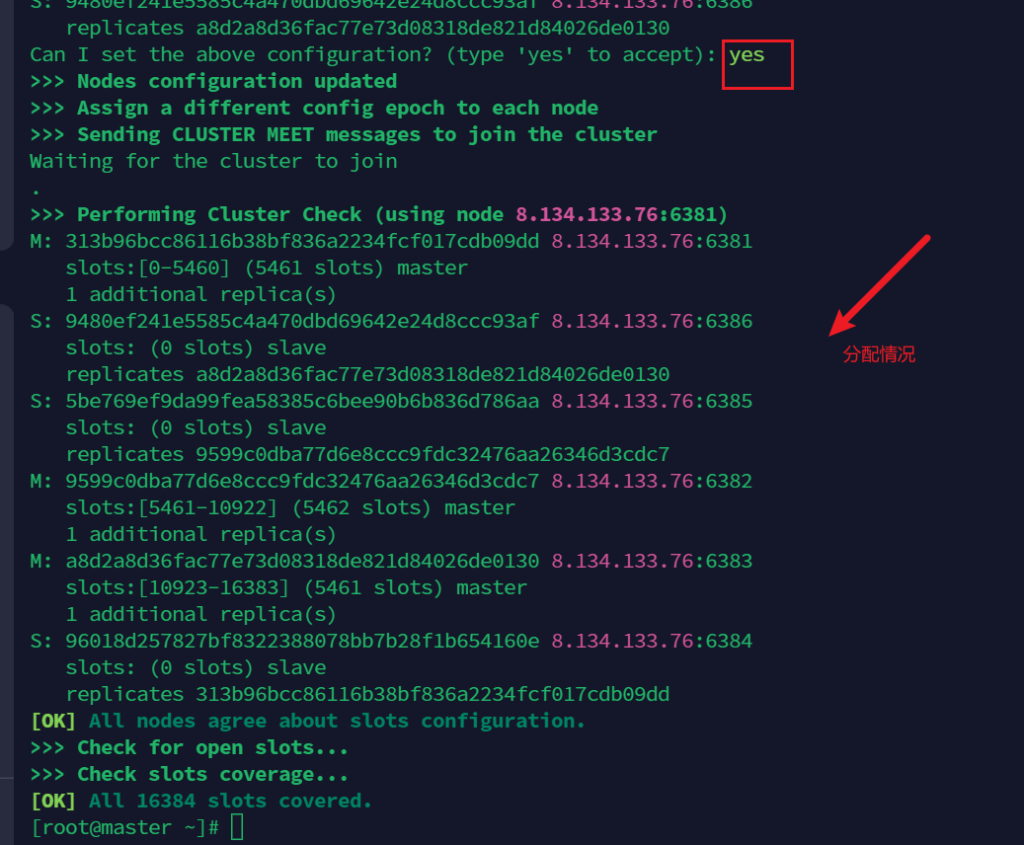 现在构建主从关系。–cluster create表示创建集群,–cluster-replicas 1 表示为每个master创建一个slave节点,-a后接密码