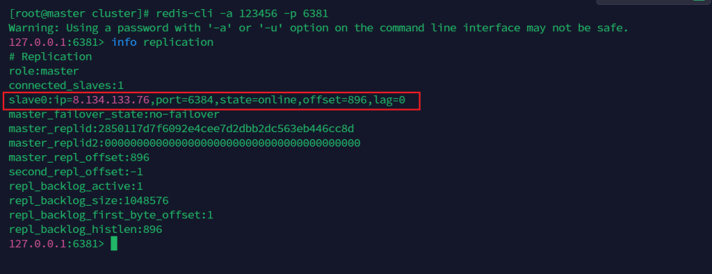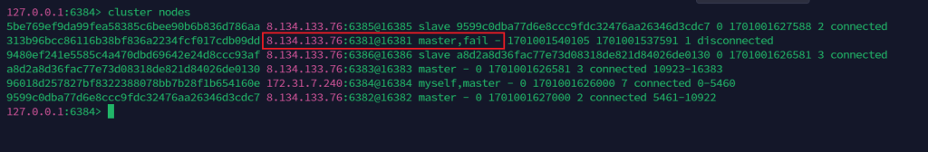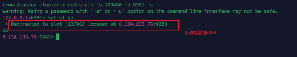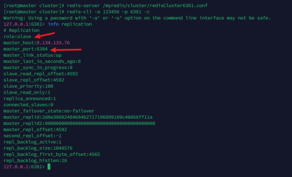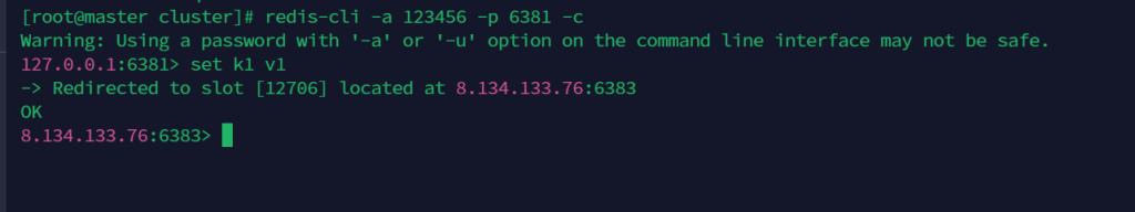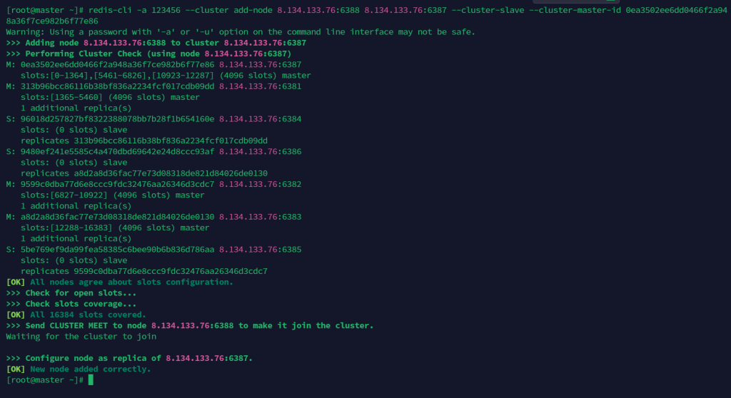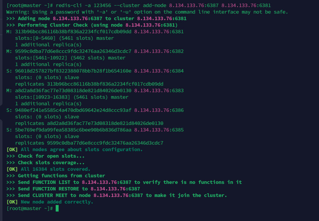 redis-cli -a 123456 --cluster add-node 8.134.133.76:6387 8.134.133.76:6381