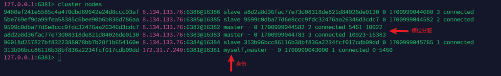 可以看到,redis6381是master,对应slave是redis6384;redis6382是master,对应slave是redis6385;redis6383是master,对应slave是redis6386。