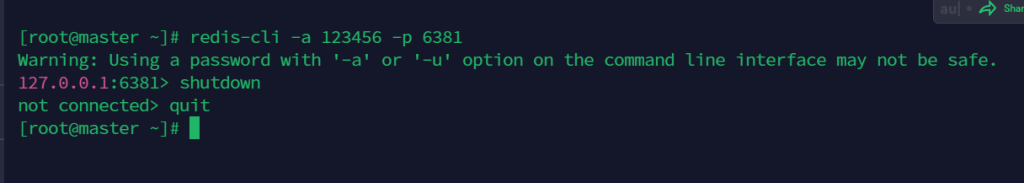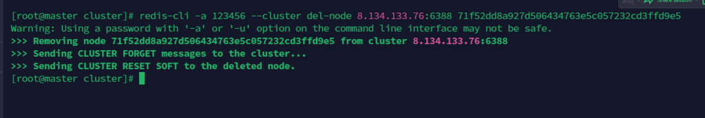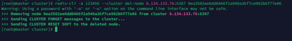 redis-cli -a 123456 --cluster del-node 8.134.133.76:6387 0ea3502ee6dd0466f2a948a36f7ce982b6f77e86