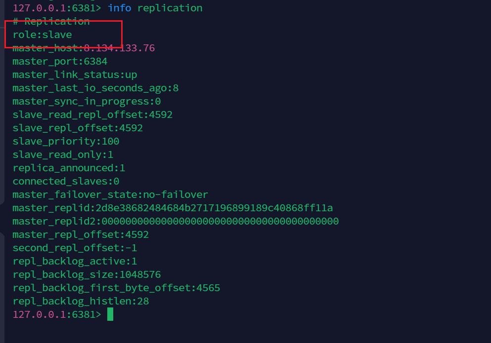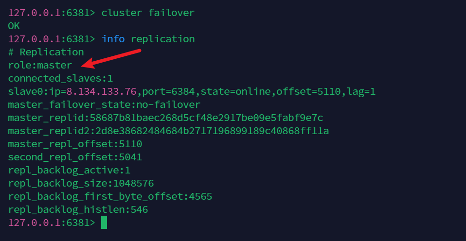 关闭一个master,如6381,上面可以看到其对应的slave主机是redis6384。