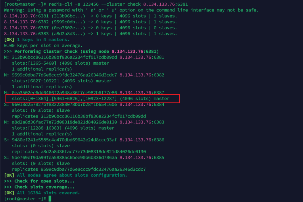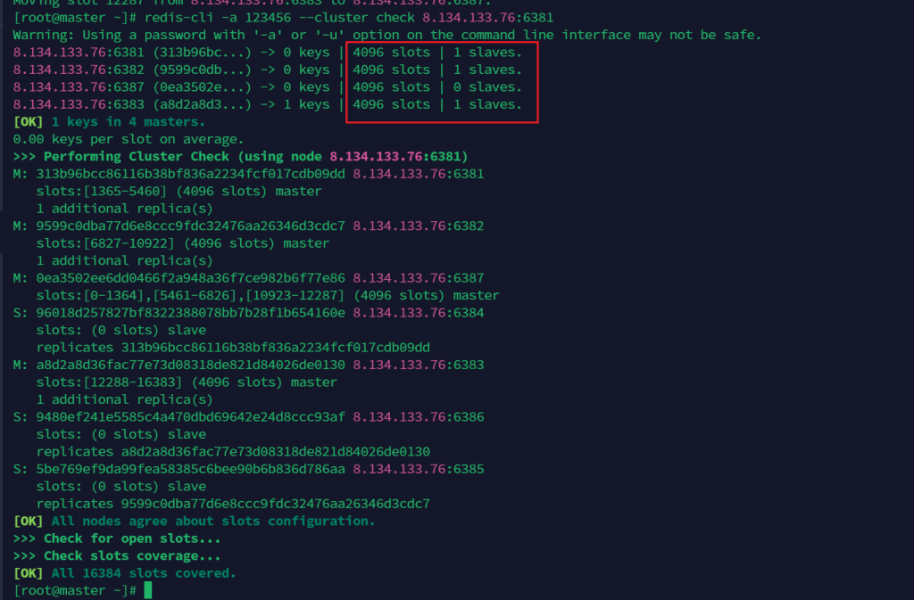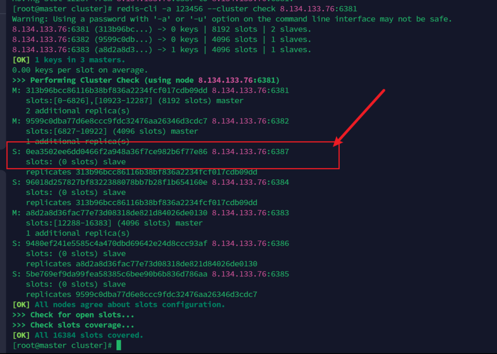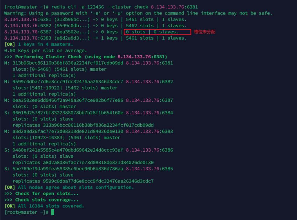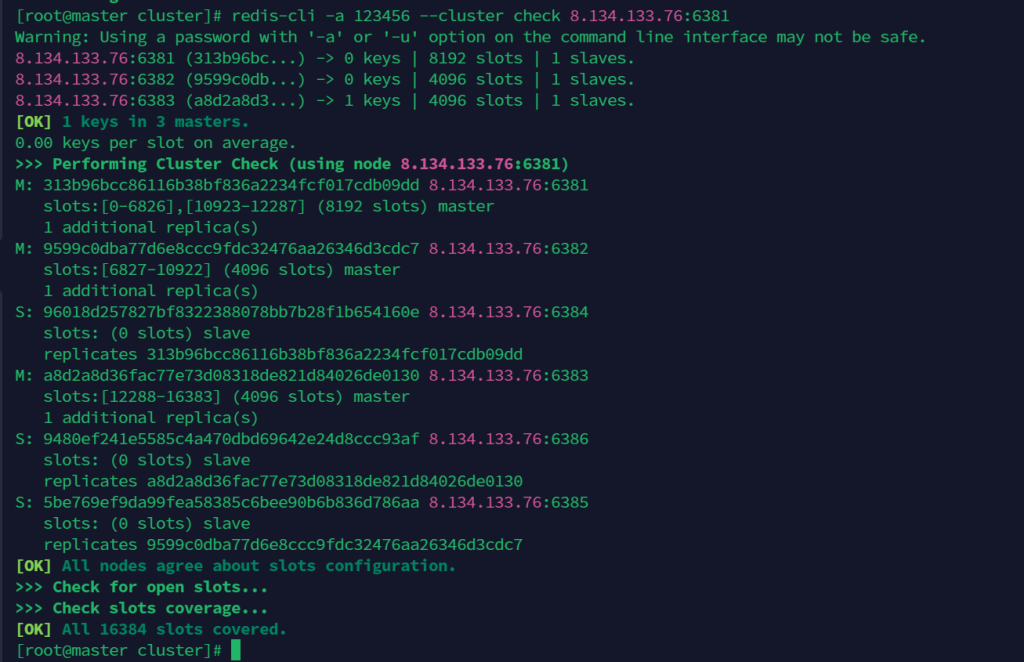 redis-cli -a 123456 --cluster check 8.134.133.76:6381