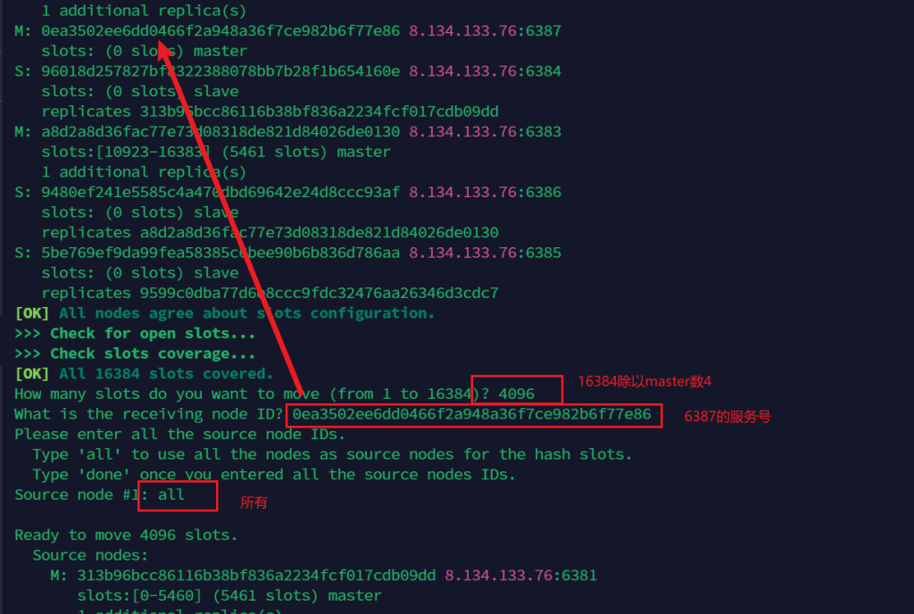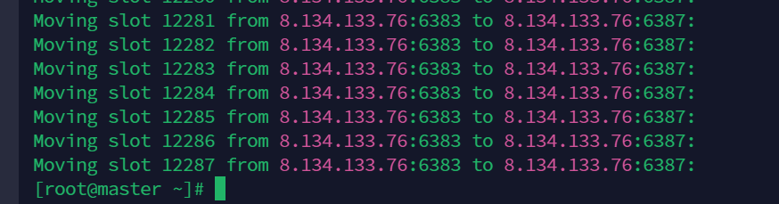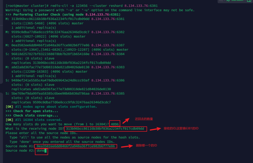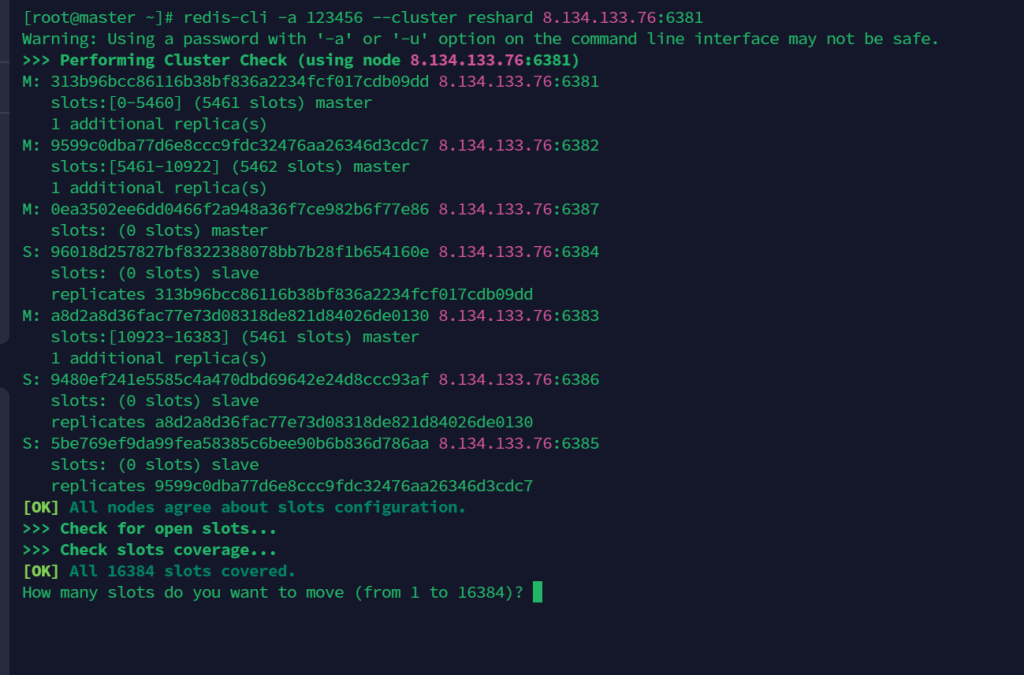 redis-cli -a 123456 --cluster reshard 8.134.133.76:6381