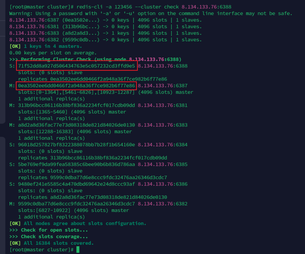 redis-cli -a 123456 --cluster check 8.134.133.76:6388