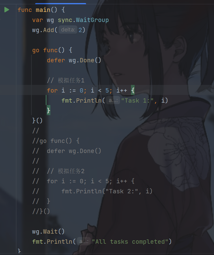 • Add(delta int):向 WaitGroup 添加指定数量的等待任务,delta 可以是正数也可以是负数。当 delta 的值为正数时,表示新增等待任务;当 delta 的值为负数时,表示完成一部分等待任务。