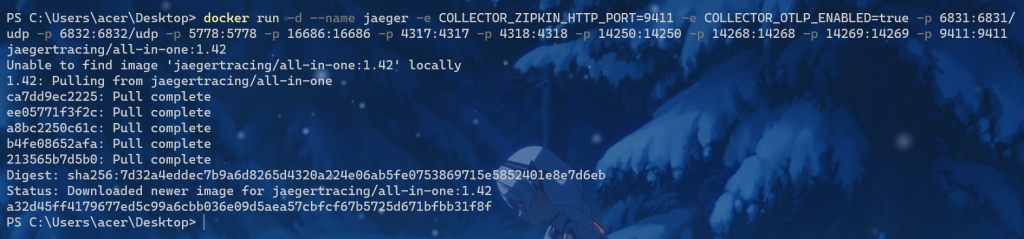 docker run -d --name jaeger -e COLLECTOR_ZIPKIN_HTTP_PORT=9411 -e COLLECTOR_OTLP_ENABLED=true -p 6831:6831/udp -p 6832:6832/udp -p 5778:5778 -p 16686:16686 -p 4317:4317 -p 4318:4318 -p 14250:14250 -p 14268:14268 -p 14269:14269 -p 9411:9411 jaegertracing/all-in-one:1.42