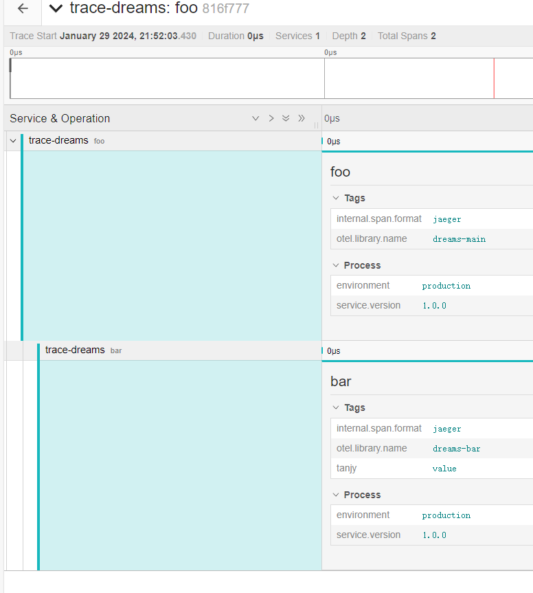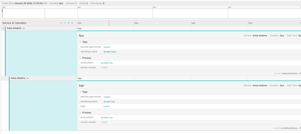 - tracer := otel.Tracer(“dreams-bar”): 创建了一个名为 “dreams-bar” 的跟踪器实例,用于在函数内部进行跟踪操作。