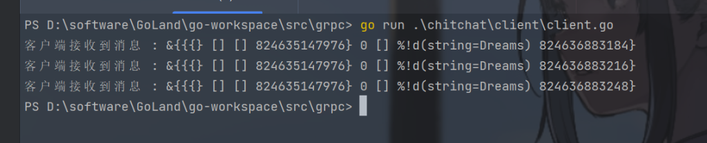 然后,代码使用 go 关键字创建了一个协程,其中使用 stream.Recv() 方法循环接收服务端的响应消息。如果接收到的响应消息是结束标志 io.EOF,则关闭 done 通道并返回。如果接收到的响应消息有其他错误,则同样关闭 done 通道并记录错误。