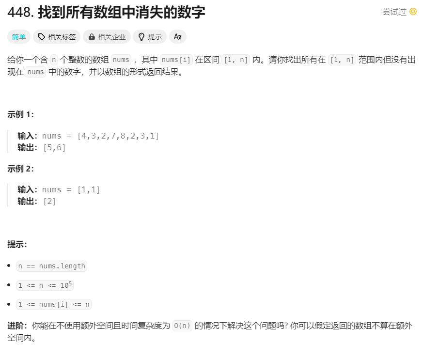 具体来说,遍历 nums,每遇到一个数 x,就让 nums[r -1] 增加 n。由于 nums 中所有数均在[1,n]中,增加以后,这些数必然大于n。最后我们遍历nums,若nums[i]未大于n,就说明没有遇到过数 i+1。这样我们就找到了缺失的数字。