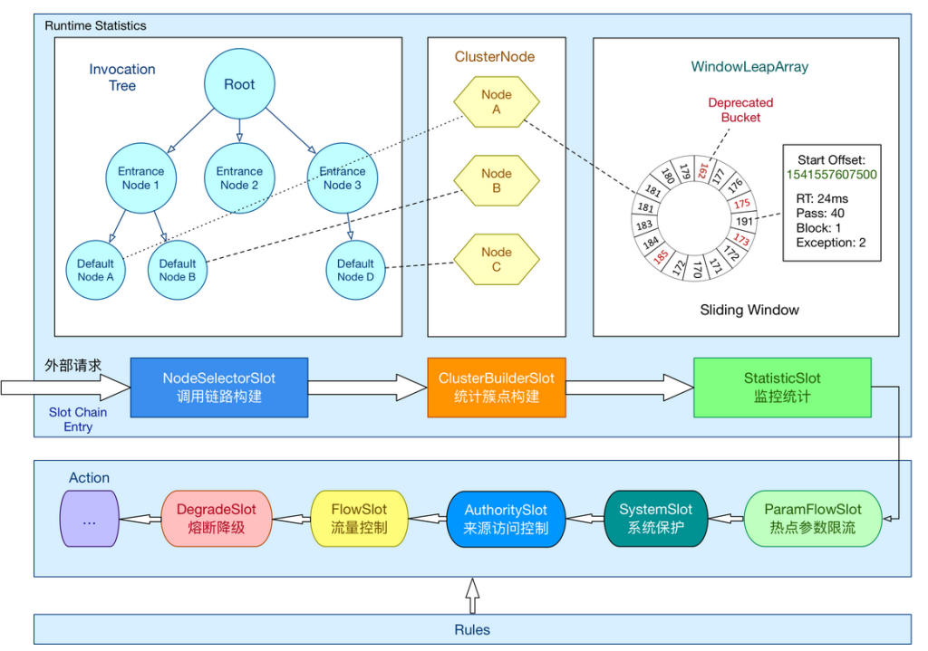 - ClusterBuilderSlot 则用于存储资源的统计信息以及调用者信息,例如该资源的 RT, QPS, thread count 等等,这些信息将用作为多维度限流,降级的依据;
