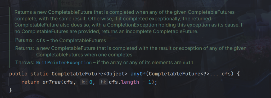 CompletableFuture<Object> any = CompletableFuture.anyOf(futureA, futureB);