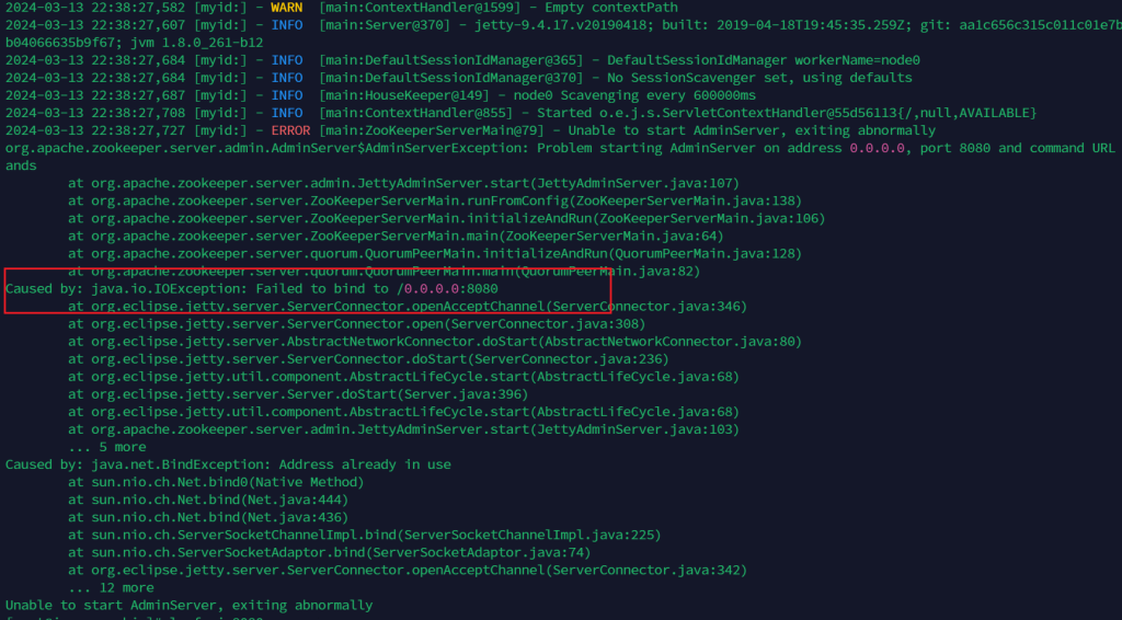 在输出日志后可以看到是因为端口被占用了