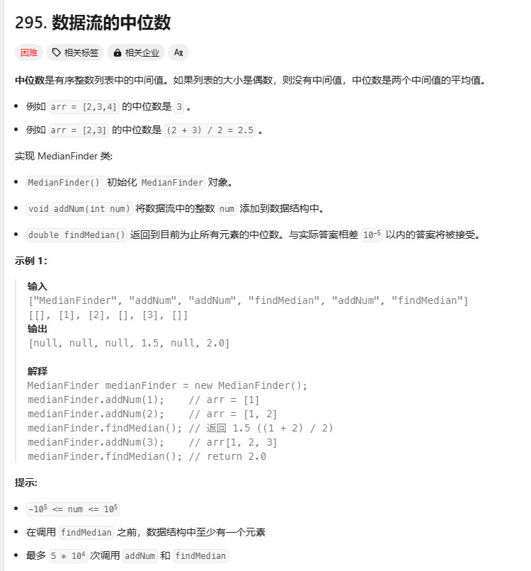 使用了两个堆来实现。左边的堆为大顶堆,右边的堆为小顶堆。添加元素时,根据两边堆的大小,将新元素加入到对应的堆中,并且保持左右两边的数据量平衡。如果两边数据量一样,则将新元素加入右边,并将右边堆的最小值弹出并加入到左边堆中;如果右边数据量多,则将新元素加入左边,并将左边堆的最大值弹出并加入到右边堆中。